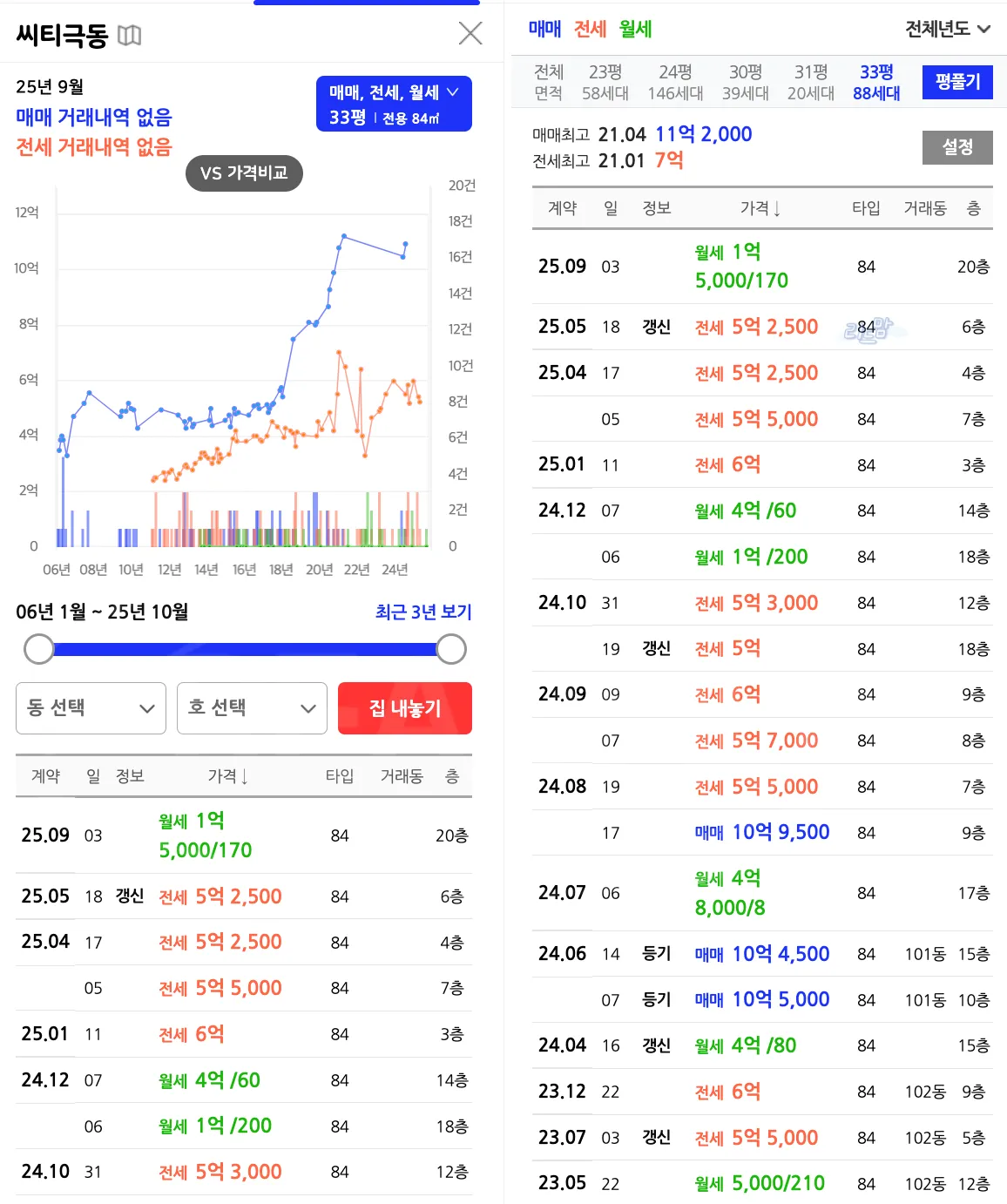 씨티극동 33평형은 매매 10억 9500에 거래되었다.