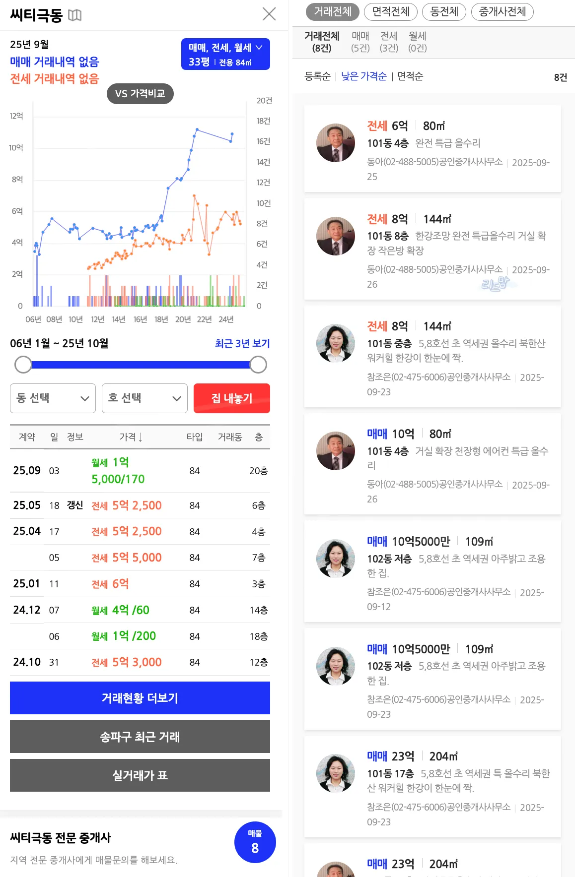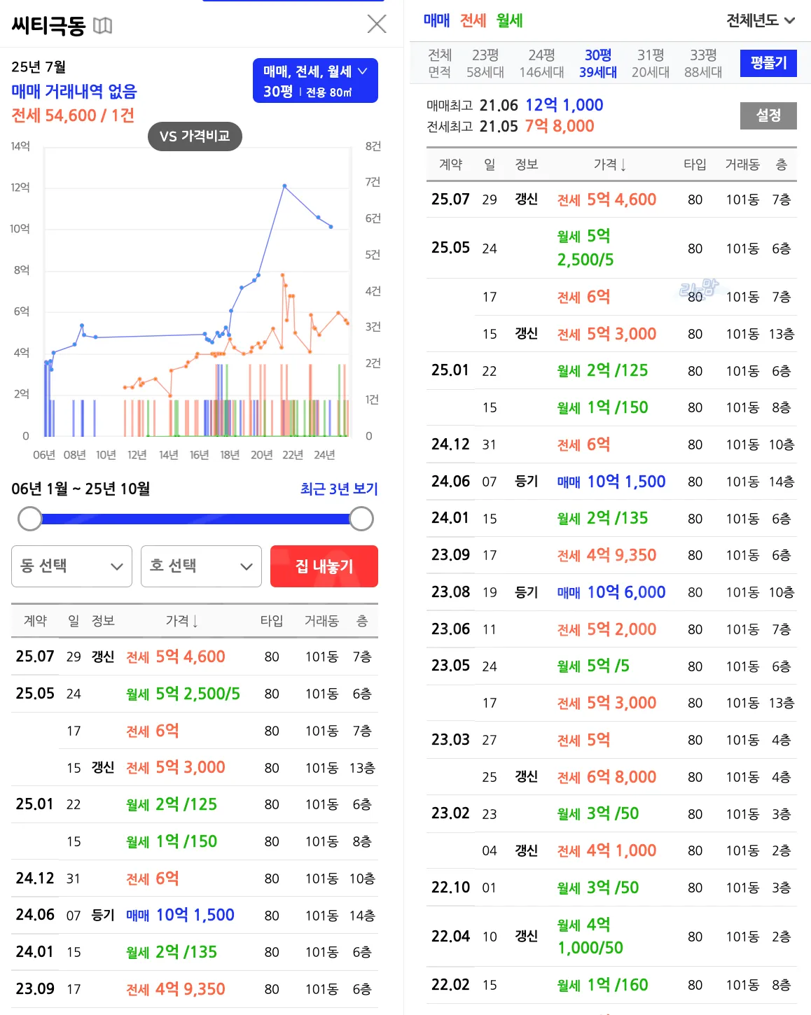 씨티극동 30평은 24년 6월에 매매 10억 1500에 거래되고 거래가 없다.