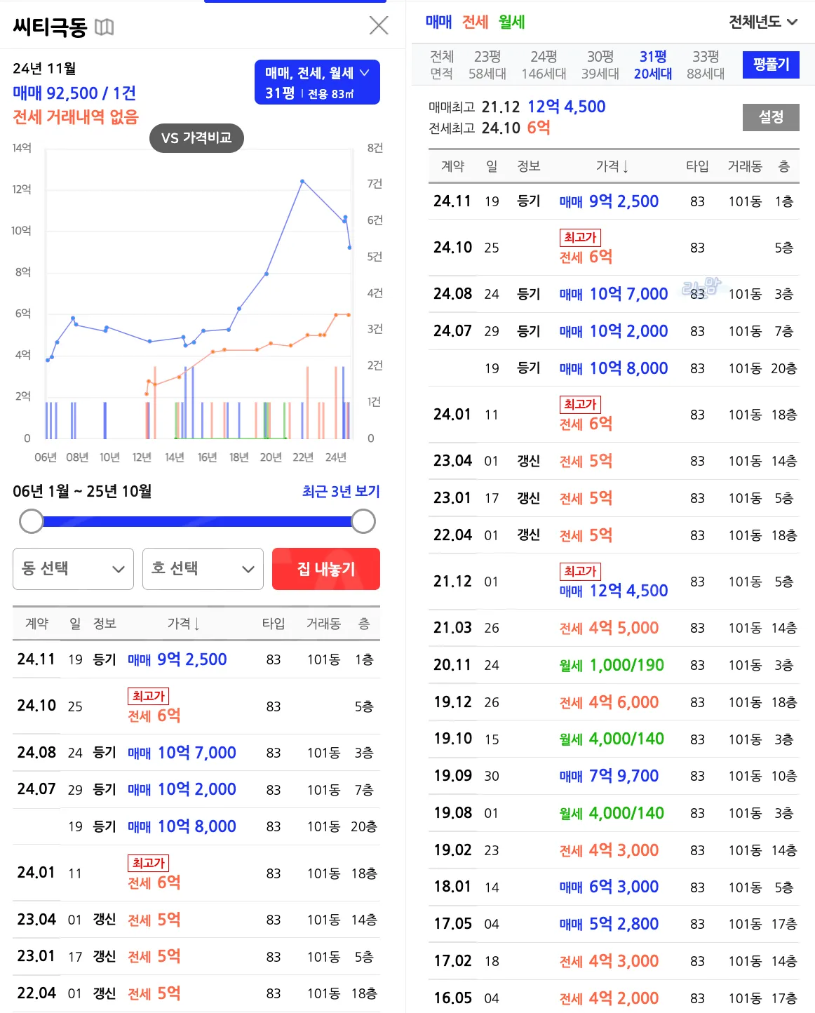 씨티극동 31평형은 24년 10억 후반까지 거래되었다. 최고가인 12억 4500에는 아직 미치지 못했다.