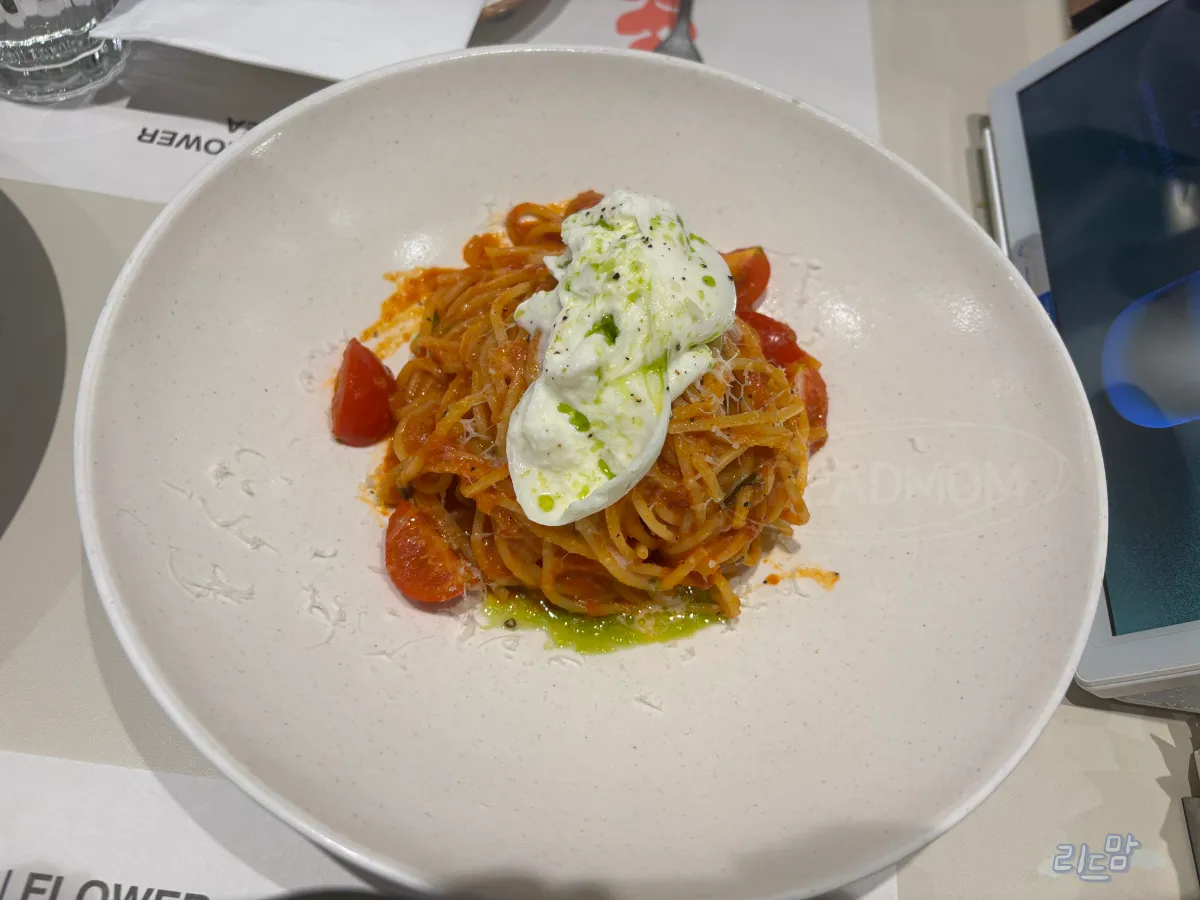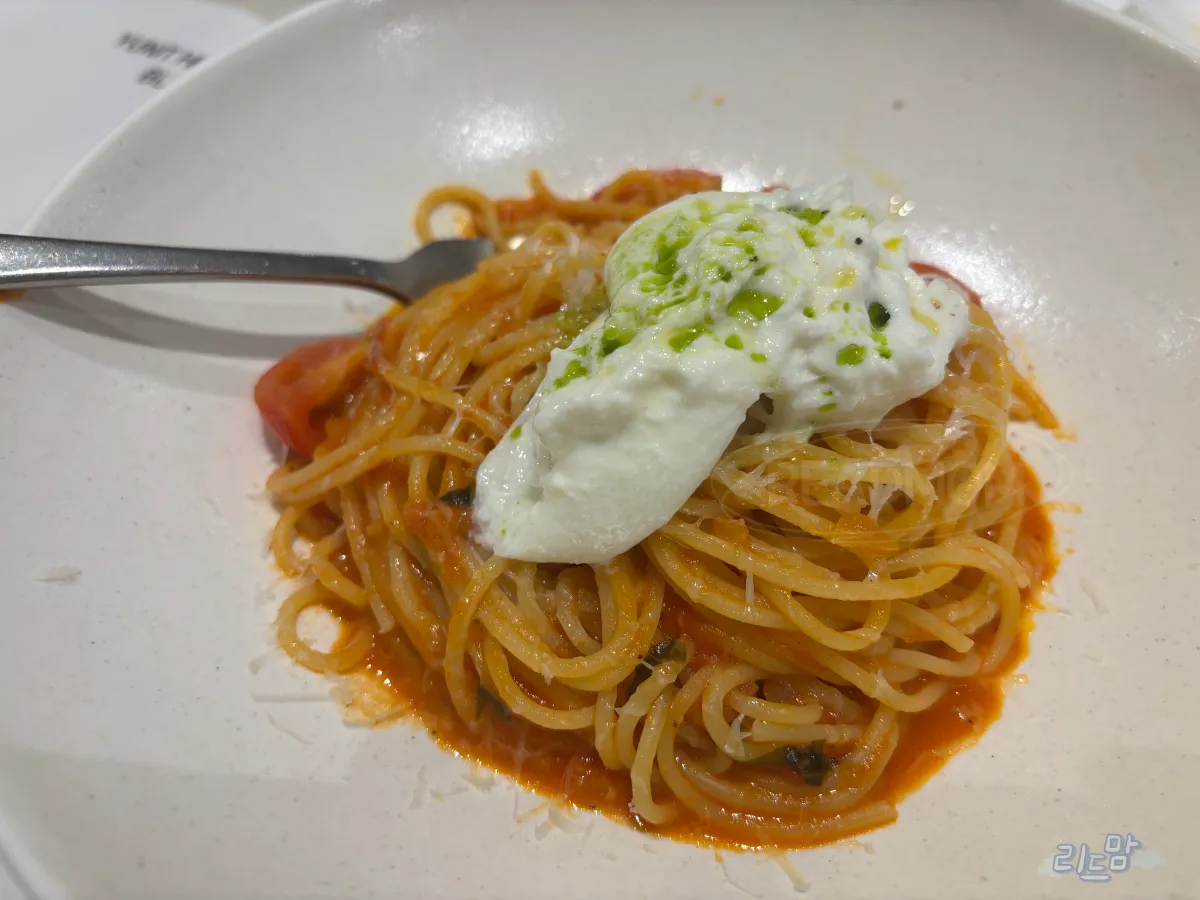 그래서 나온 두 번째 파스타. 부라타치즈가 올라간 토마토파스타인데 치즈도 맛있고 제일 기본적인 토마토소스맛이라 좋았다.