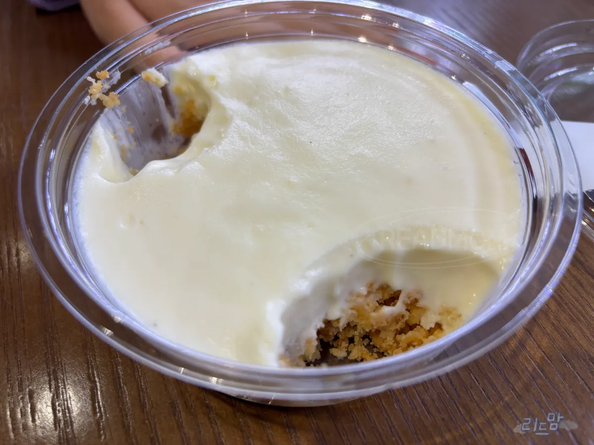 안에 비스킷이 잘게 잘라져 뿌려져 있고 위에 치즈는 부드러운 크림 같은 치즈다.