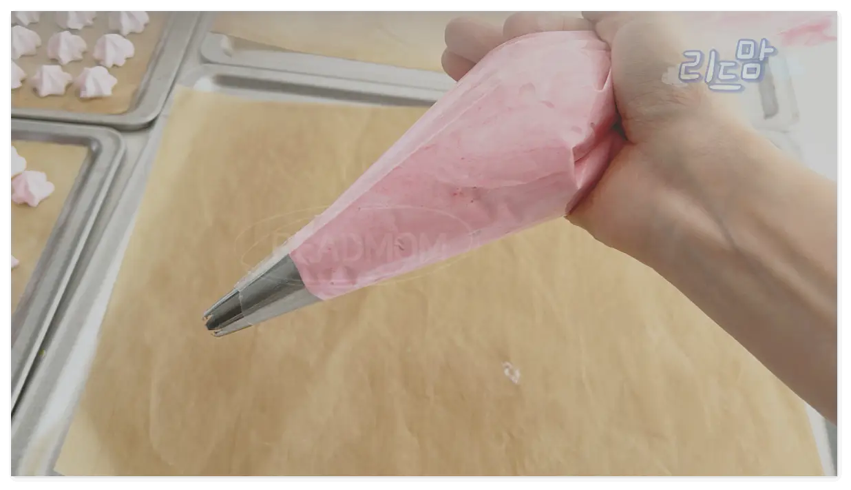 이제 본격적으로 머랭을 짜줍니다. 조색이 잘 되었죠? 머랭이 죽을 수 있으니 너무 많이 섞지 않아도 됩니다. 흰색을 먼저 짜주고 분홍색을 순서대로 짜주었습니다. 머랭 짜기 전에 오븐을 100도로 먼저 예열해 줍니다.