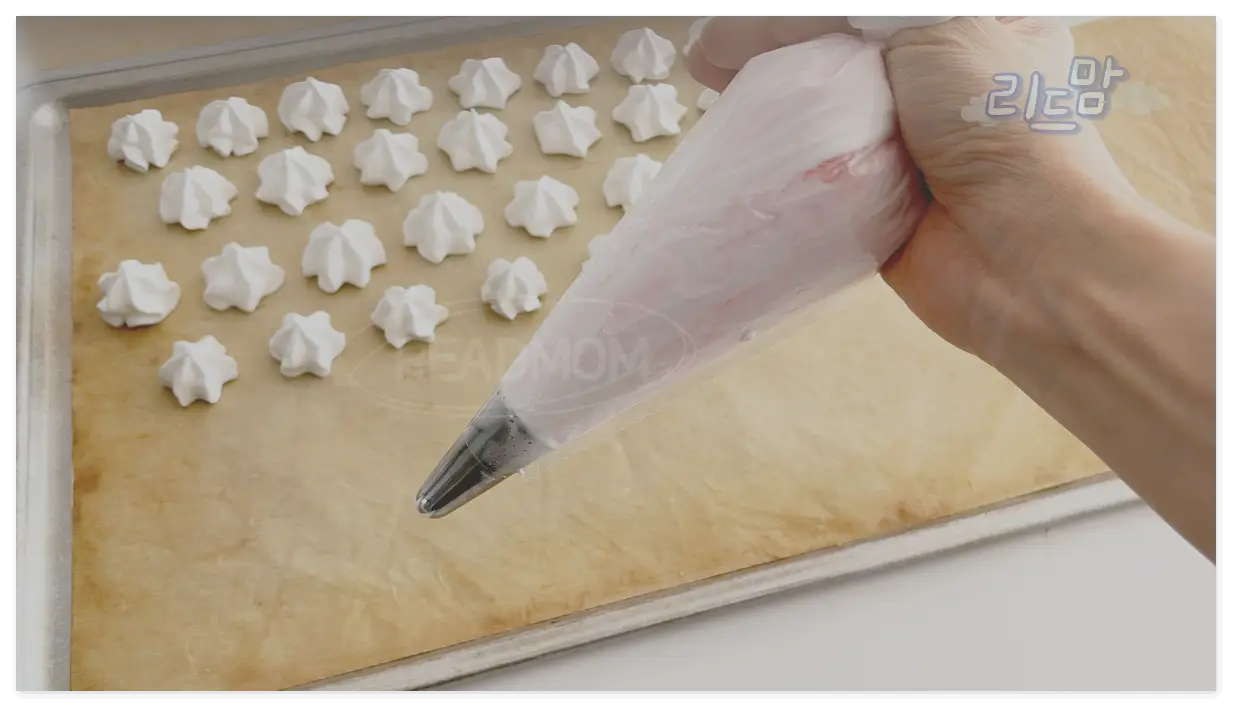 5. 윤기가 나고 단단한 머랭이 완성되면 짜는 주머니에 담아 모양을 내어 짜줍니다