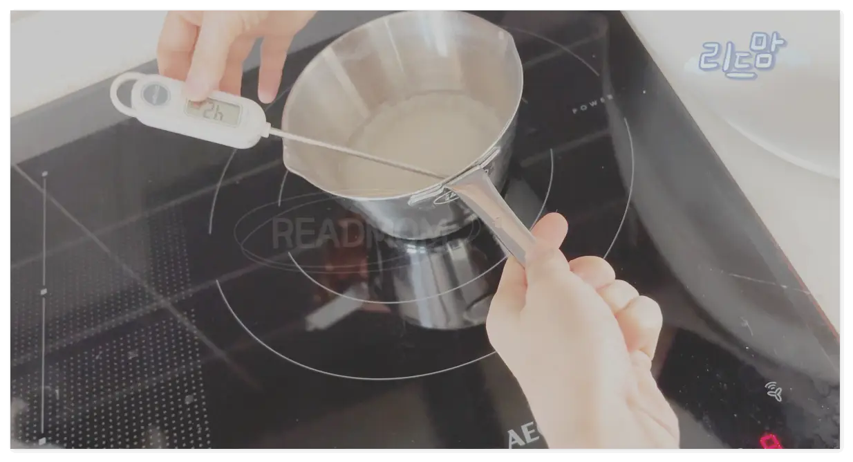 분리가 끝나면 설탕시럽을 위한 준비도 해줍니다. 설탕 195g에 물 78g을 넣고 시럽을 끓여줍니다. 중불에서 끓이면 되지만 인덕션은 중간온도에 놔두면 시럽이 끓지 않기 때문에 처음에는 중간온도 그다음 서서히 온도를 올려줍니다. 설탕이 다 녹고 바글바글 끓어오르다 118도가 되면 시럽이 완성입니다. 여기서 팁! 117.5도로 올라오면 불을 꺼주세요 금방 118도가 넘어가 버립니다. 118도가 넘어가면 결정이 생기기 시작하거든요.