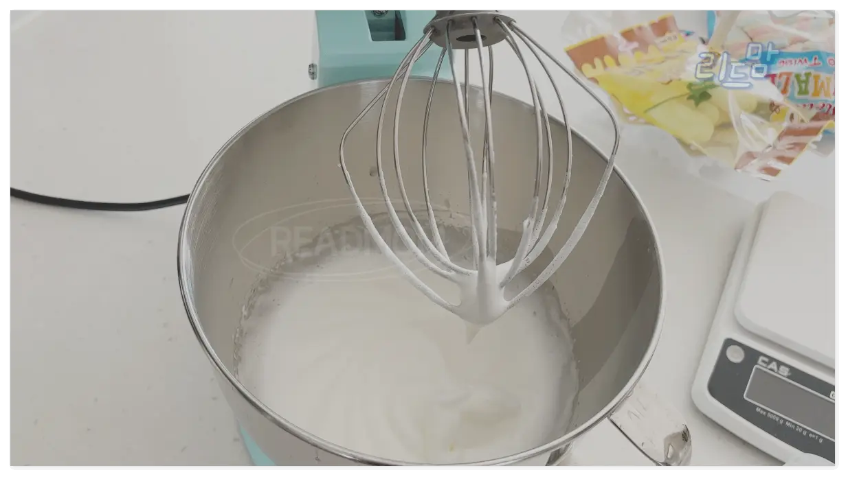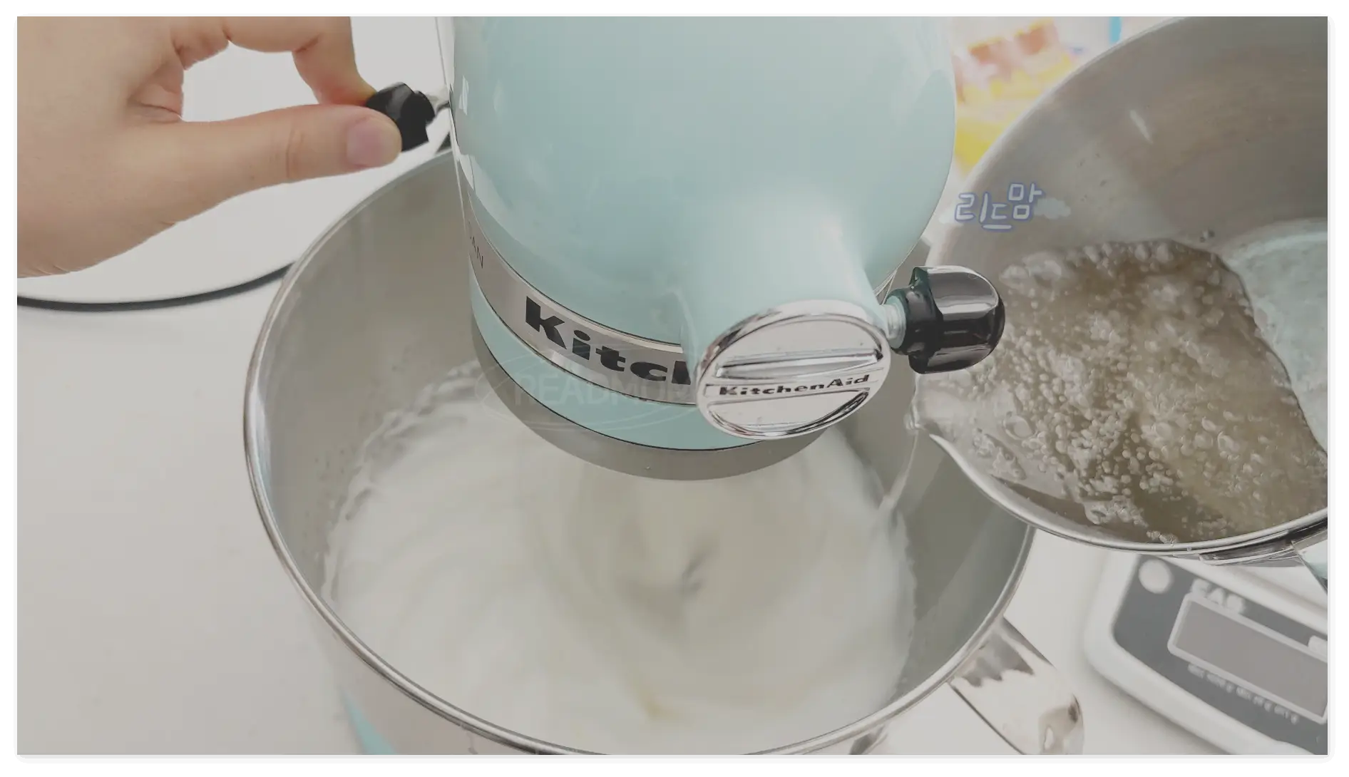 118도까지 끓인 시럽을 넣어주며 고속으로 휘핑합니다. 이때 시럽은 천천히 부어주고 거품기는 최대한 빠르게 휘핑하는 것이 포인트입니다.