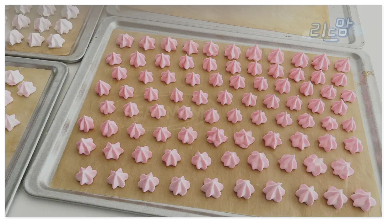 계란 4개에 스메그 오븐팬 4 팬이 딱 채워집니다. 계란 1개 하면 1판이 딱 채워지겠네요. 마지막에는 막대사탕모양 머랭쿠키도 만들어 주었어요. 다른 오븐도 사용해 봤지만 스메그 오븐에서 머랭쿠키가 정말 잘 구워지는 것 같아요. 마카롱도 그렇고요.