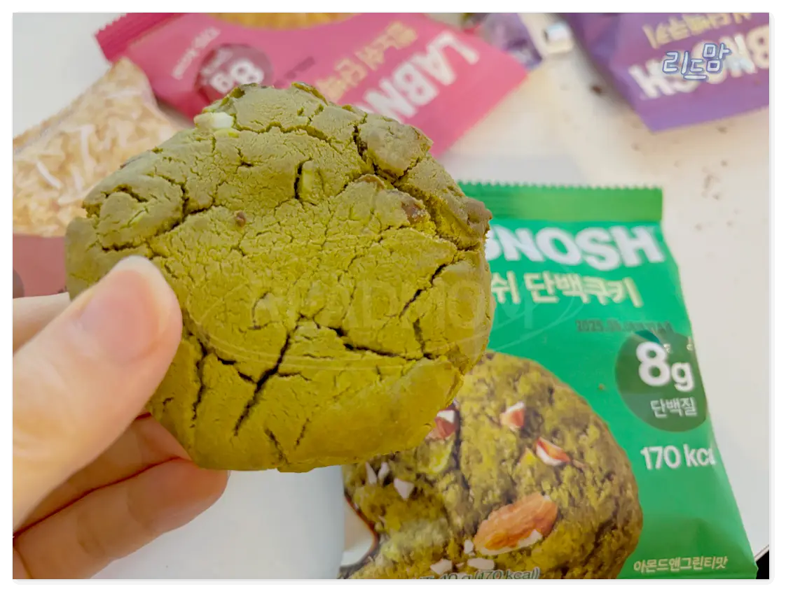 단백질 8g 170kcal입니다. 녹차와 아몬드가 들어간 쿠키로 인기가 많은 맛이죠. 그런데 랩노쉬 아몬드 녹차쿠키 맛은 그저 그랬습니다. 부드럽거나 바삭하지 않고 퍽퍽하고 심심한 맛이었어요.