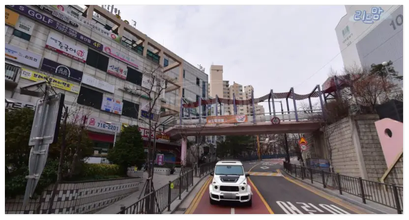 다리가 멋들어지지는 않구요. 그래도 위에 가리개도 되어있습니다. 상가에 학원들이 많이 보입니다. 어린이 보호구역이라서 학생들이 안전하게 건너갈 수 있도록 만든 것도 같네요.
