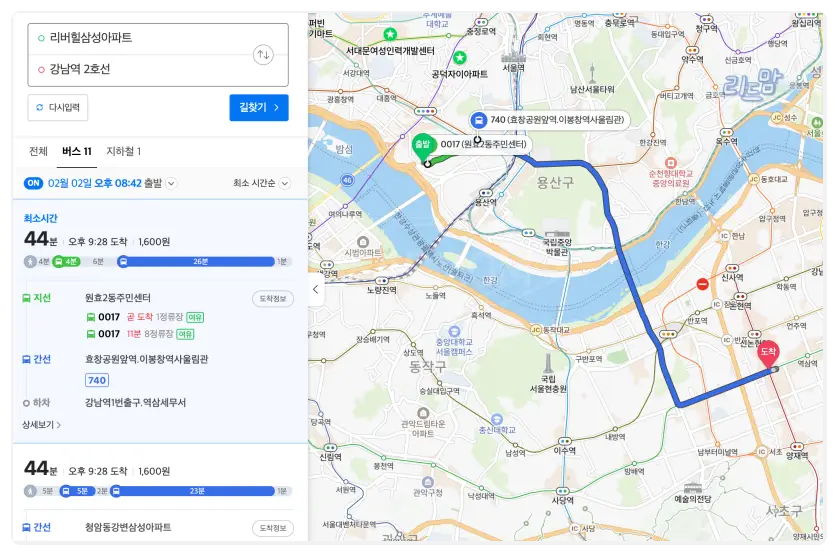 버스로 44분 지하철로 45분이 걸립니다. 지하철을 타려면 16분을 걸어서 마포역을 이용합니다. 걷기에는 조금 애매한 거리여서 주로 버스를 이용할 것 같습니다. 출근시간에는 접근성이 떨어질 수 있겠네요.