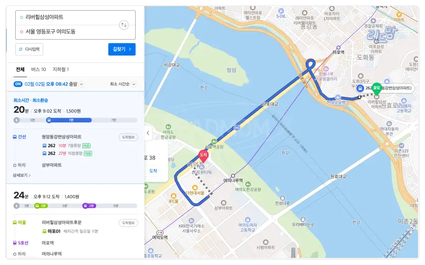 시청역까지 버스로 30분정도가 걸립니다. 여러 번 갈아타면 26분이지만 한 번에 가는 게 훨씬 편하니 이용하진 않을 것 같네요. 한 번에 가는 버스가 있어서 리버힐 삼성에서 종로 접근성은 좋습니다. 지하철로도 갈 수 있지만 도보로 16분 마포역으로 이동 후 다시 10분 정도를 걸어야 해서 잘 이용하진 않을 것 같네요. 거리상으로 가까워도 접근성이 좋지 않을 수도 있네요. 하지만 절대적인 시간이 적어 접근성은 여전히 좋습니다.