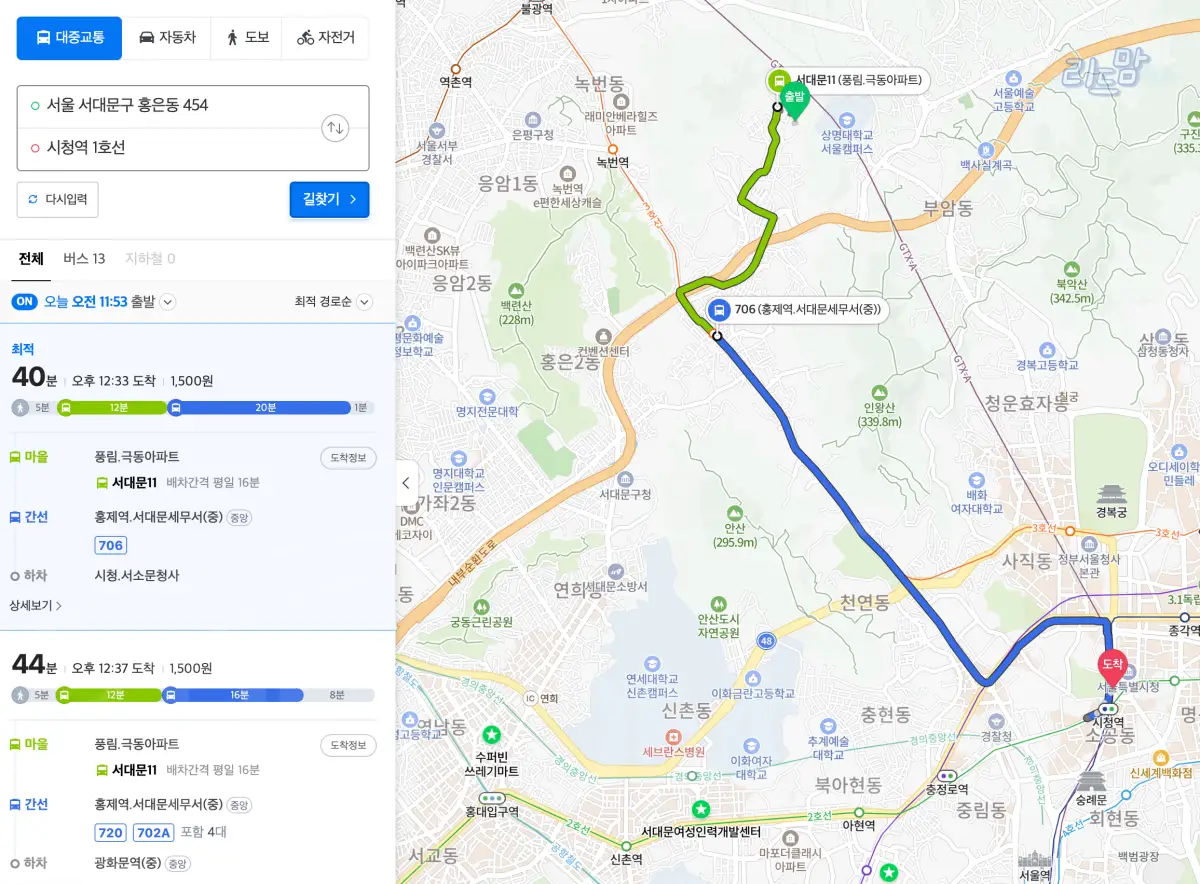 홍은극동아파트에서 시청까지는 총 40분이 걸린다. 다행히 버스도 한 번만 갈아탄다.