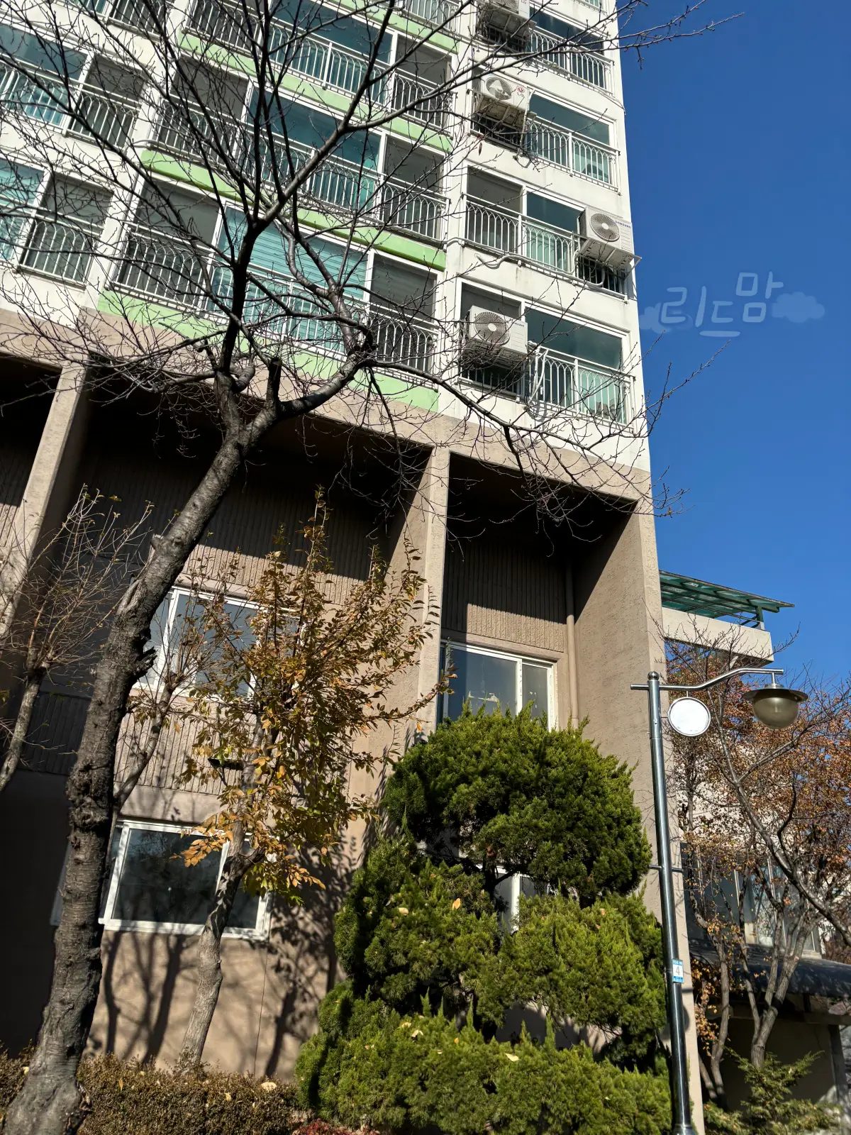 금호두산 단지와 그 옆 주택들이 대조된다. 겨울이어서 나뭇가지가 앙상하다. 3층부터가 세대가 시작되는 것 같은데 1,2층은 무언지 모르겠다.