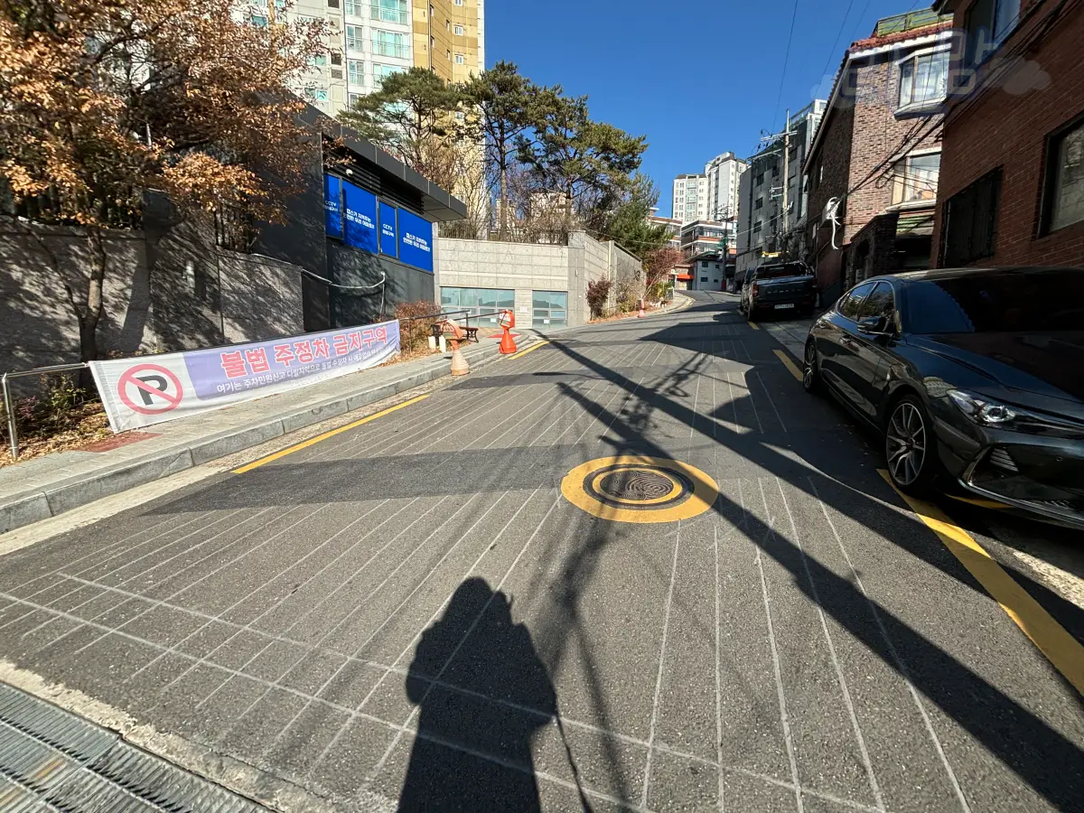 그리고 불법주정차 금지구역 현수막도 걸려있다. 이렇게 경사가 심한 곳에도 불법주정차가 가능하단 말인가? 생각하는데 옆에 떡하니 차들이 주차되어 있다. 가능하구나..
