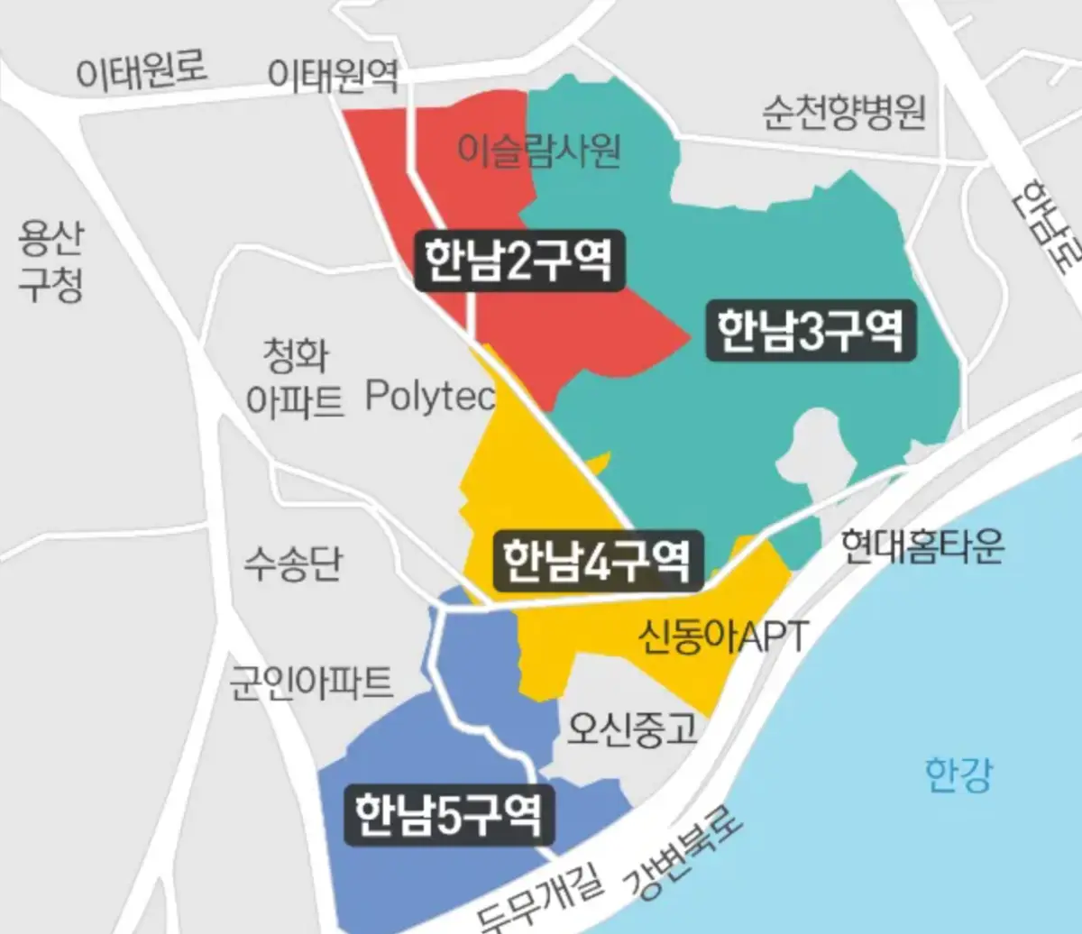 한남 2,3,4,5 구역입니다. 지도로 보니 한남 3 구역이 왜 사업성이 좋다고 하는지 알겠네요.