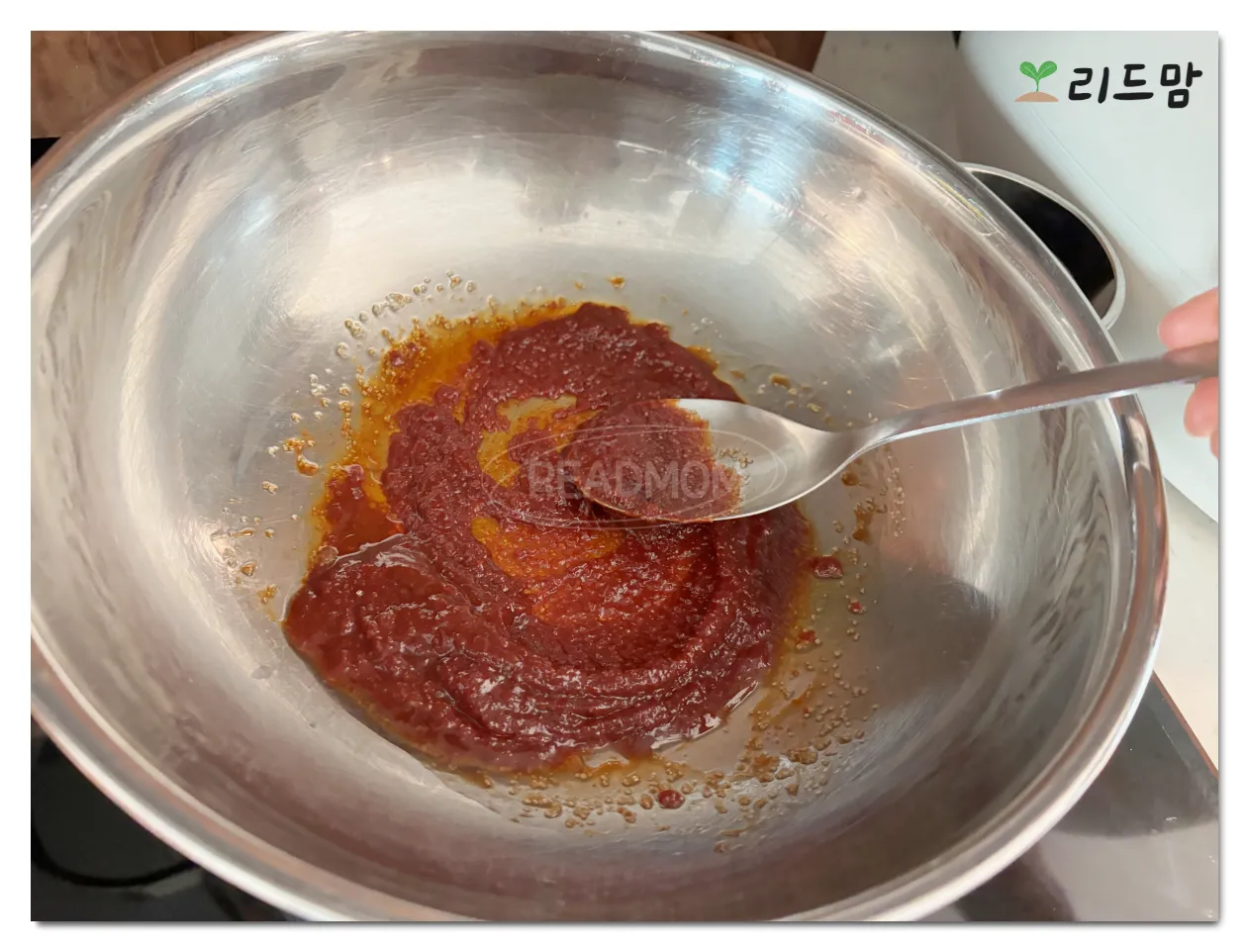 이렇게 하면 양념이 더 맛있어집니다. 식용유가 살짝 들어가서 맛이 부드러워요. 너무 센 불에 하면 고추장이 금방 타버립니다. 약불에 천천히 볶아주세요. 초등학생 아이정도면 충분히 할 수 있지만 불을 사용하니 옆에서 지켜봐 주시는 것이 좋습니다. 양념을 잘 섞어서 타지 않게 볶아주는 것이 양념준비의 전부이자 가장 중요한 단계입니다. 꼭 잘 저어서 볶아주세요.