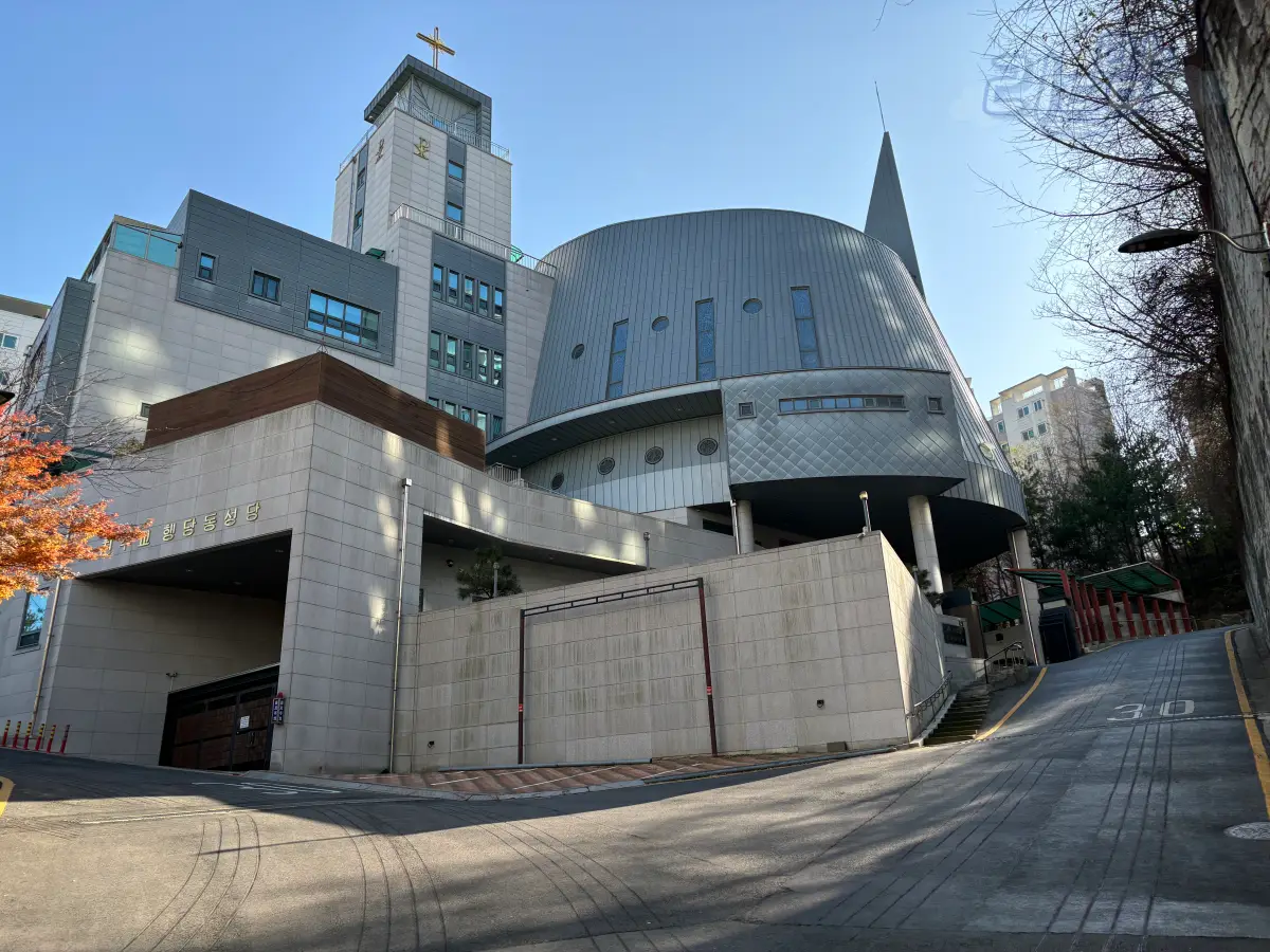 행당동 성당이 크게 자리잡고 있다. 우주선 같은 외관이 눈에 띄었다. 올라오는 길이 그늘에다 사람도 다니지 않아 외진 느낌이었는데 성당이 눈에 보이니 마음이 편안해지는 느낌이었다. 공포 영화에서 보면 음지에서 스멀스멀 나쁜 기운이 나오다가 갑자기 교회나 십자가 보고 싹 사라지는 그 느낌.